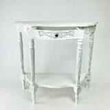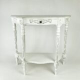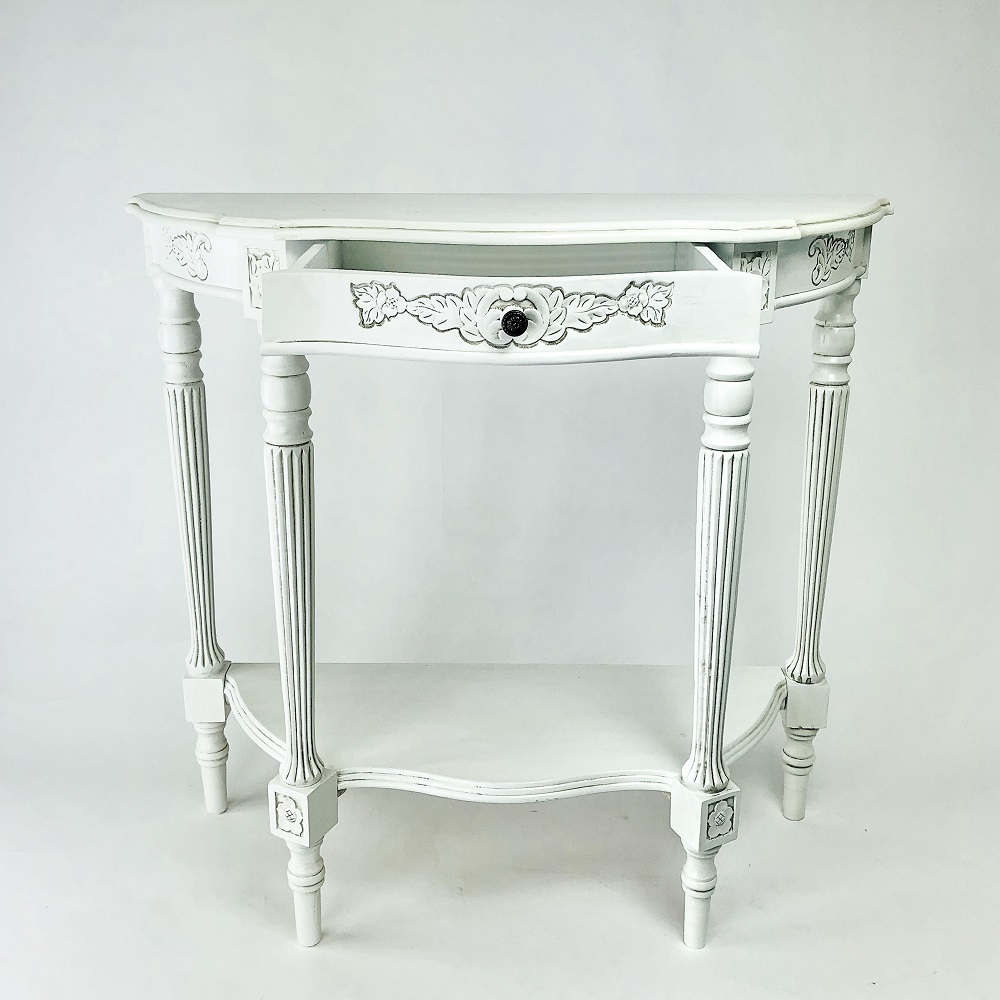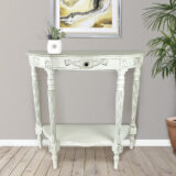 Birchwood; Color: Antique White; Assembly Required; Smooth Finish; Carved design; One shelf and one drawer; Drawer 13Wx10Dx2″H; Shelf space 15Wx11Dx20″H; Leg 2Wx2Dx7″H