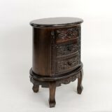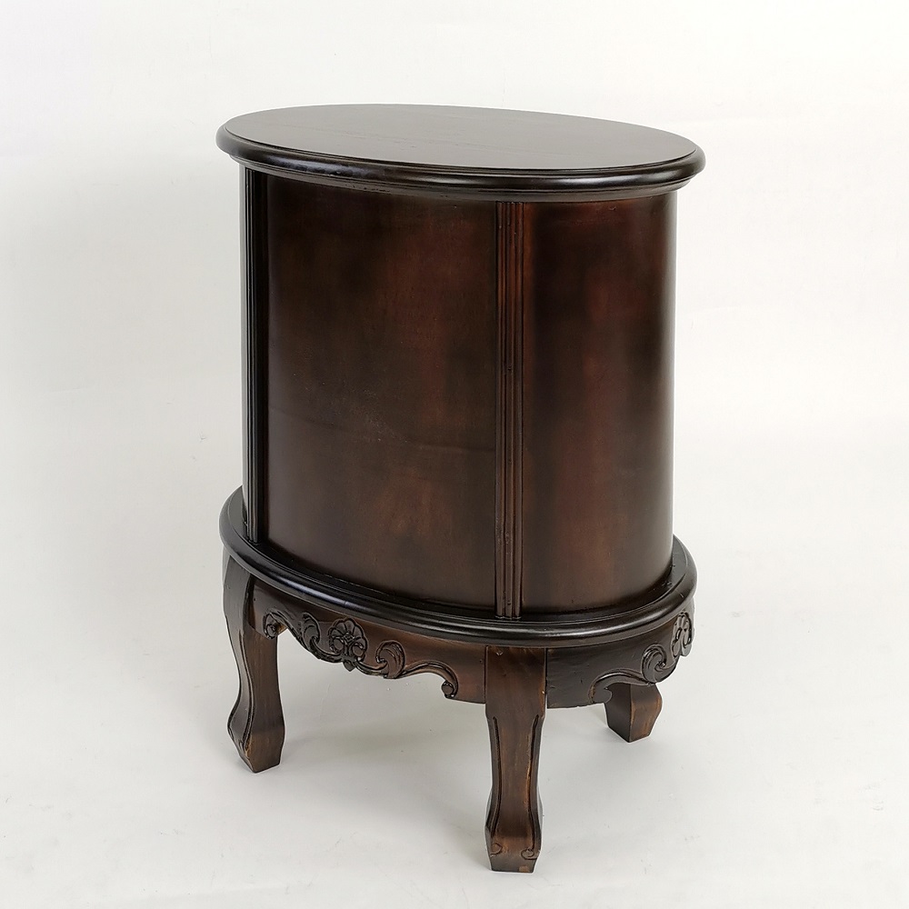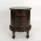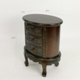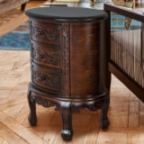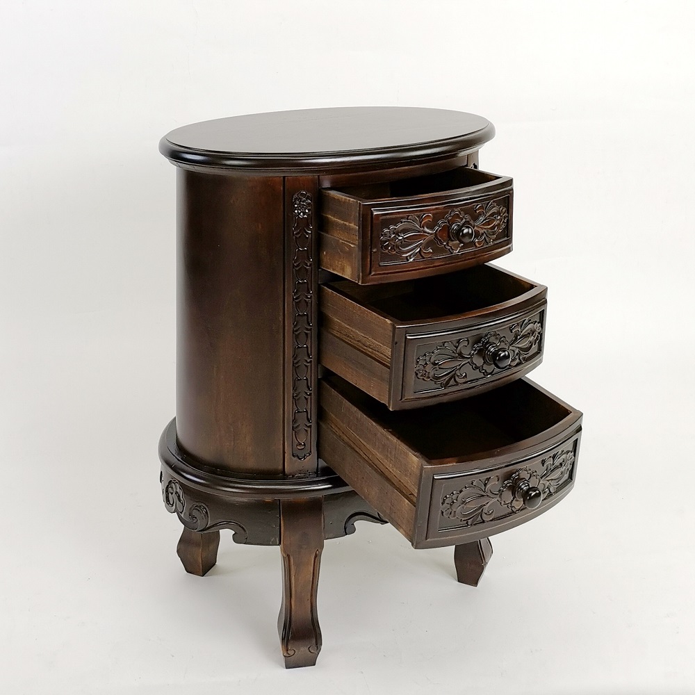 Birchwood; Color: Brown; Assembly Required; Smooth Finish; Carved design; Three drawers; Drawer measures 9Wx9.5Dx3″H; Legs 2Wx1.5Dx6″H