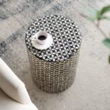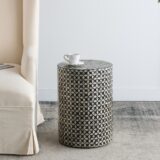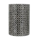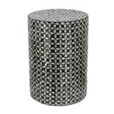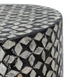 This black accent stool features Capiz inlay within its geometric patterning and works beautifully in a living room or family room. The cylindrical structure gives the piece contemporary appeal and versatility within any layout. The round surface makes this equally useful as a stool or a tabletop.
