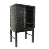 Basswood; Color: Ant. Black; Assembly Not Required; Antique Smooth Finish/Worn with Red under Coat; Two door cabinet; Hand painted and assembled; Space behind the door is 29Wx20Dx23.5″H on top & 6.5″H below the shelf; Fixed shelf; Brass hardware; Legs are 20″H