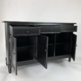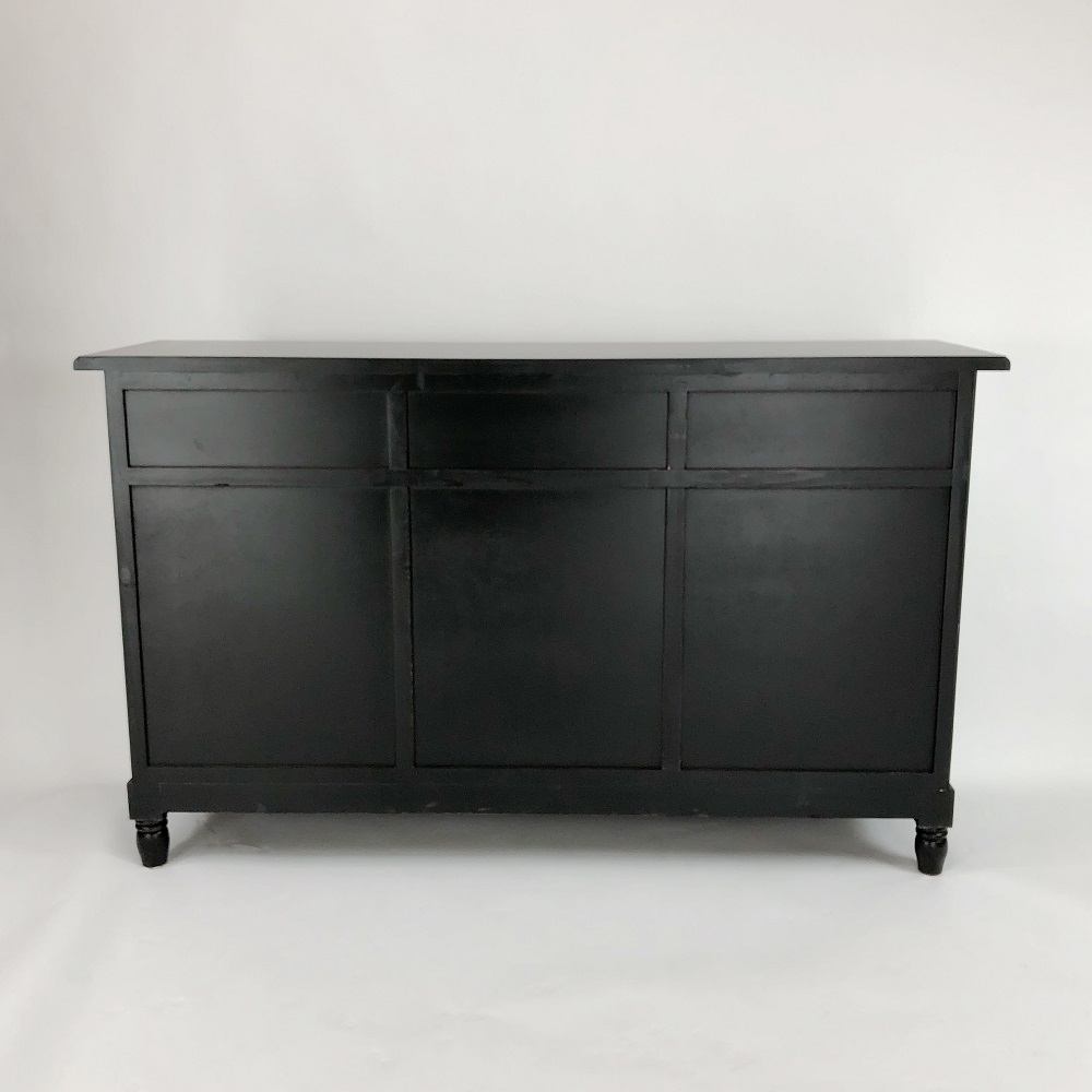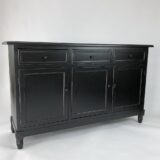 Pine wood; Color: Ant. Black; Assembly Not Required; Antique Smooth Finish/Worn with Red under Coat; Three drawers with three doors; Drawers measure 16Wx13.5Dx4.5″H; Space behind each door is 16.5Wx14.5Dx9.5″H above & below shelf; Fixed shelf