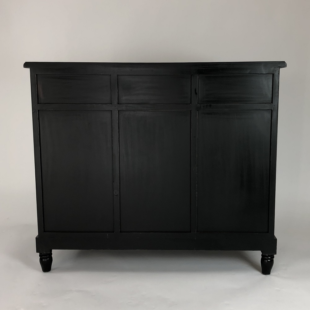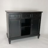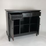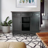 Basswood; Color: Ant. Black; Assembly Not Required; Smooth Finish; All three drawers are 11x15x4″H; Each door has 1 fixed shelf in the middle; Middle shelf-12″W X 16″D X 10″H; Behind doors 12×15.5×9 7/8″H on top & bottom of shelf