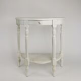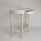 Basswood; Color: Whitewash; Assembly Not Required; Antique Smooth Finish/Worn; Console table with rattan shelf; Drawer measures 12Wx10Dx1.5″H; Wooden hardware