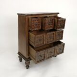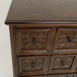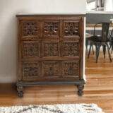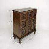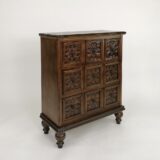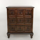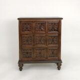 Standing proudly in the corner of the room, the chest of drawers exudes an air of timeless elegance. Its sturdy wooden frame is adorned with intricate hand-carved floral motifs, each petal and leaf etched by skilled artisans, a testament to their craftsmanship and attention to detail. Five drawers, each of varying widths, provide ample storage space for garments, linens, or cherished keepsakes. The warm, honey-toned wood is accentuated by the subtle sheen of a protective varnish, enhancing the natural beauty of the grain and adding a touch of luster to the piece. Brass drawer pulls, delicately shaped like blooming flowers, complement the floral carving, adding a hint of vintage charm to the chest. Whether placed in a bedroom, living room, or hallway, this exquisite piece of furniture not only serves a practical purpose but also elevates the aesthetic of its surroundings, transforming any space into a sanctuary of style and sophistication.