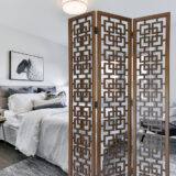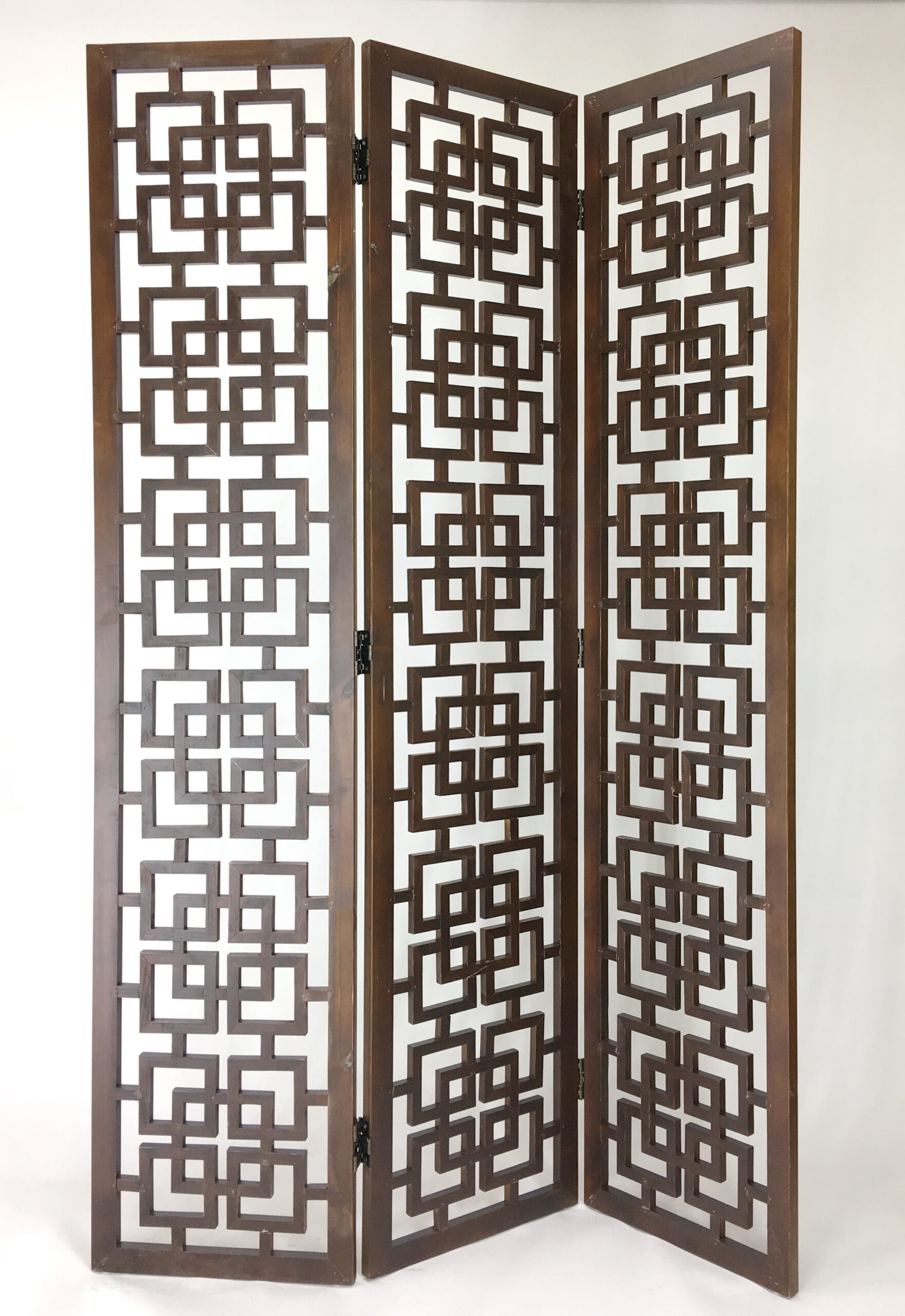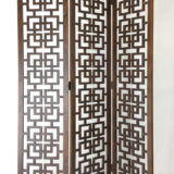 Featuring a sturdy and well-build room divider, this three panel screen has a beautiful open cut geometric pattern. Offering an elegant and traditional look you can still provide privacy while letting the light shine through. This stylish room divider works double duty as a privacy screen or against a wall to use as an accent piece. Used in a large open space, this screen will help divide a room while displaying an openwork art piece so you can see between both sides of the room. While against a wall it can be use behind a bed as an artful headboard or on the wall as an open art decor. Whichever room you decide to put this room divider it will help tie up your whole ambiance and bring a wonderful flow to your home.