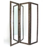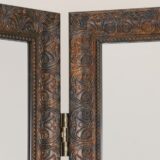 Mirror w/Resin Frame; Brown/Gold Color; Carved Finish; No Assembly Required; Back is Black Velvet; Brown/Gold colored resin; Each panel 19.75Wx72″H; Resin frame is 2.25″W all the way around; Mirror is 15.25Wx67.5″H; Brass double hinge; Item Dimension: 60″X20″X72″