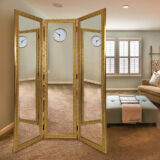 Enhance the look of your space with this beautiful golden vintage style full length mirror. With its double hinges you can fold the mirrors to fit any space from a corner to an open wall. This room divider has a clean sleek look and the gold trim details with bring elegance to the current decor in the room. While best in a bedroom you can place this mirror where you want to get a good last glance of your full attire. This full size floor mirror can be place in a room to open up the space and let the light bounce around the whole room. No matter where you place this room divider it will a pop of glamour to your current decor and will be a perfect addition to your home.