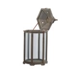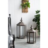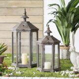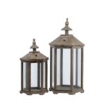 Display your favorite decorative candles within the transparent glass walls of this wood lantern set. The wood framing takes on the shape of a tall gazebo or airy temple, finished in a weathered texture to give the illusion of age. This set includes one small and one large lantern.
