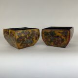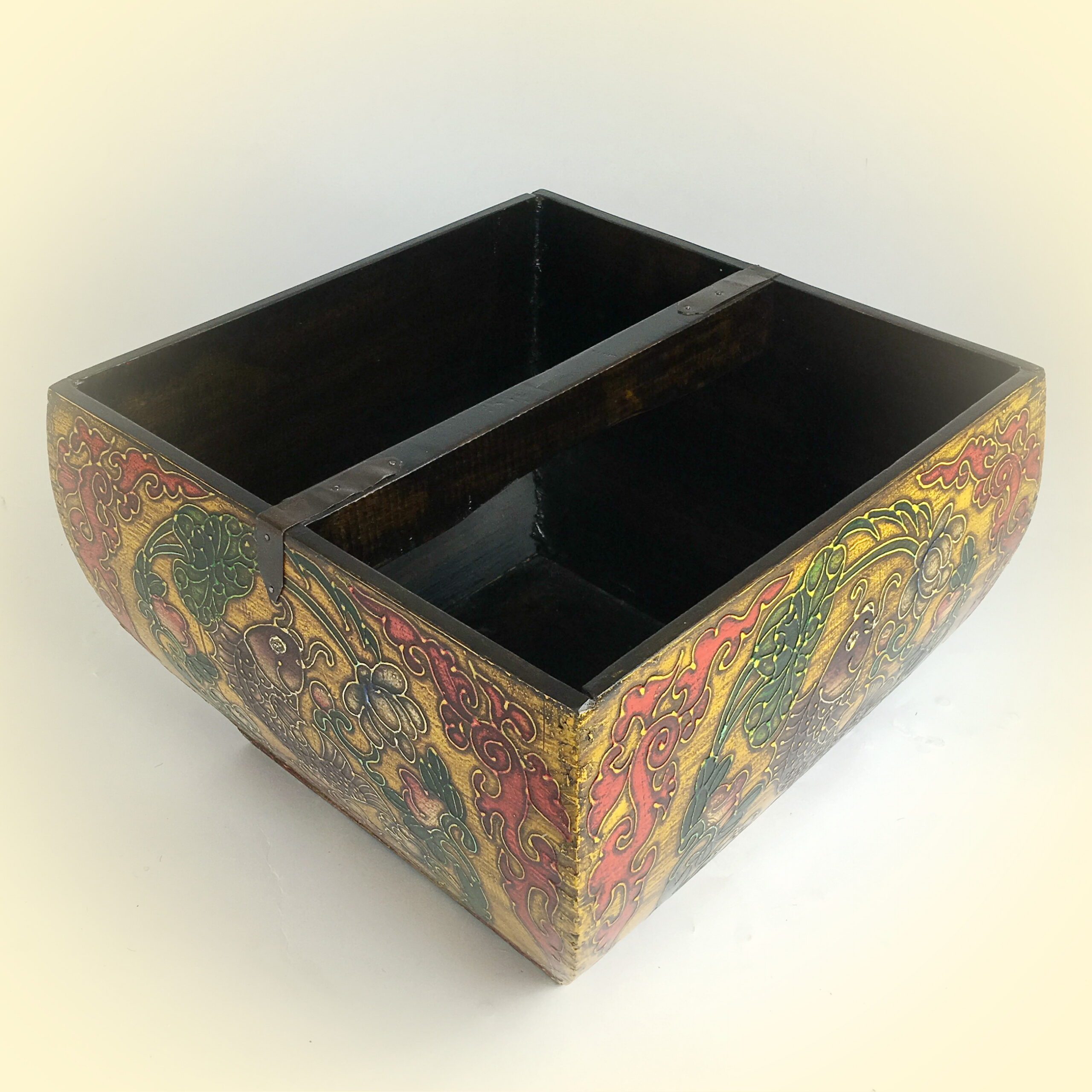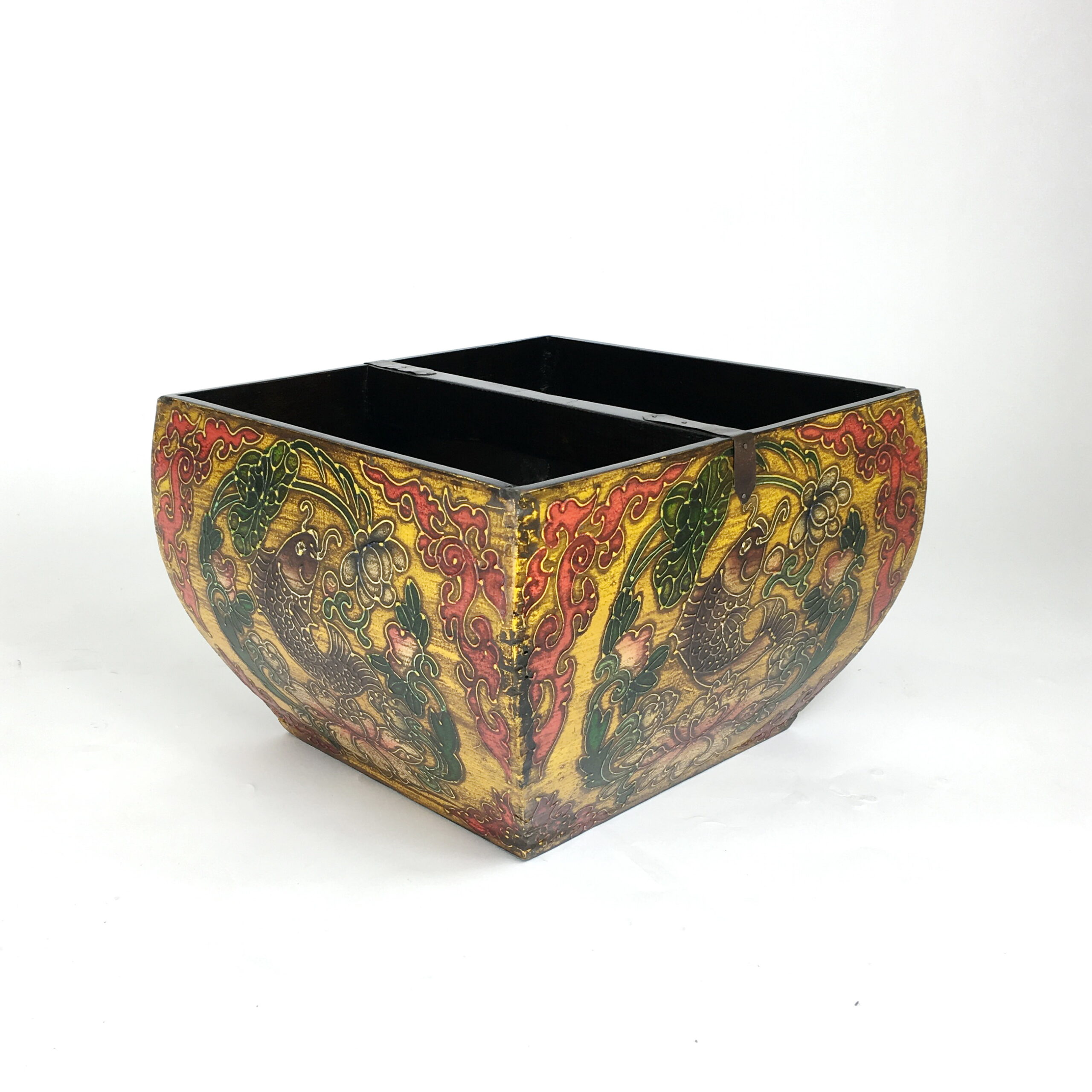 Decorative faux-antique wooden storage bucket. Hand painted lotus design on each side against a distressed yellow background with visible wood grain. Mitered wood frame with metal hardware for added durability. Interior divided and finished with a matte black lacquer. Rustic display for office or kitchen supplies, or for use as an indoor planter or decorative accent.