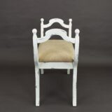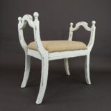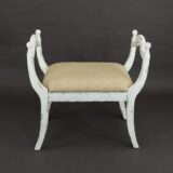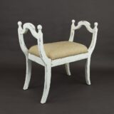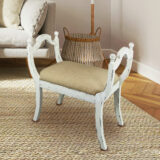 Add an element of vintage charm to your foyer, living room or bedroom with the Harlow bench. It can also serve as a decorative vanity chair. Featuring a slightly curved frame and rustic burlap upholstery, it is finished with white paint and distressed details.