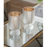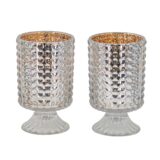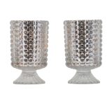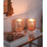 Give candlelight a rosy gleam with the shining rose gold mercury inside this set of 2 hobnail glass hurricane candle holders. Made out of 100% glass, these candle holders shine whether the candles inside are lit or not. They make an eye-catching accent for any the decor of any living room or dining room.