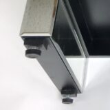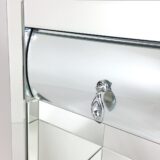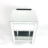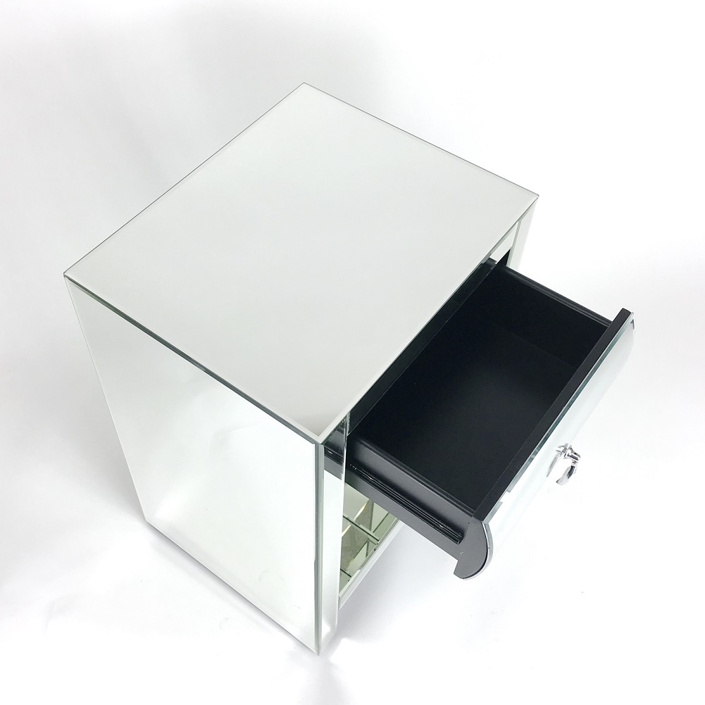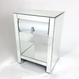 Color: Mirror; Assembly Not Required; Smooth Finish; Item Dimensions: 18″X15″X26″; Drawer is 12Wx12Dx9″H; Drawer stoppers; Open space is 14Wx15Dx12″H; Diamond cut crystal design on chrome handle; Legs 2Wx14Dx3.5″H with adjustable footer height; Mirror on pine wood