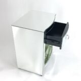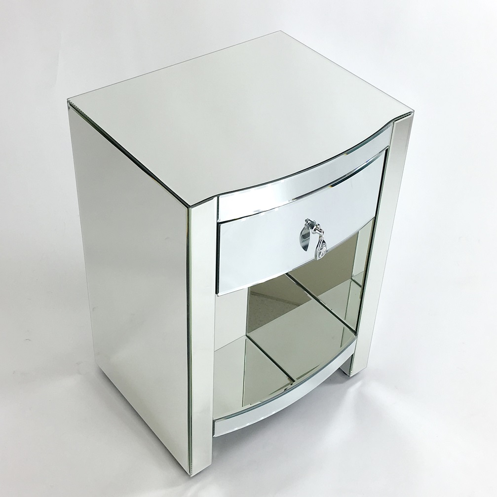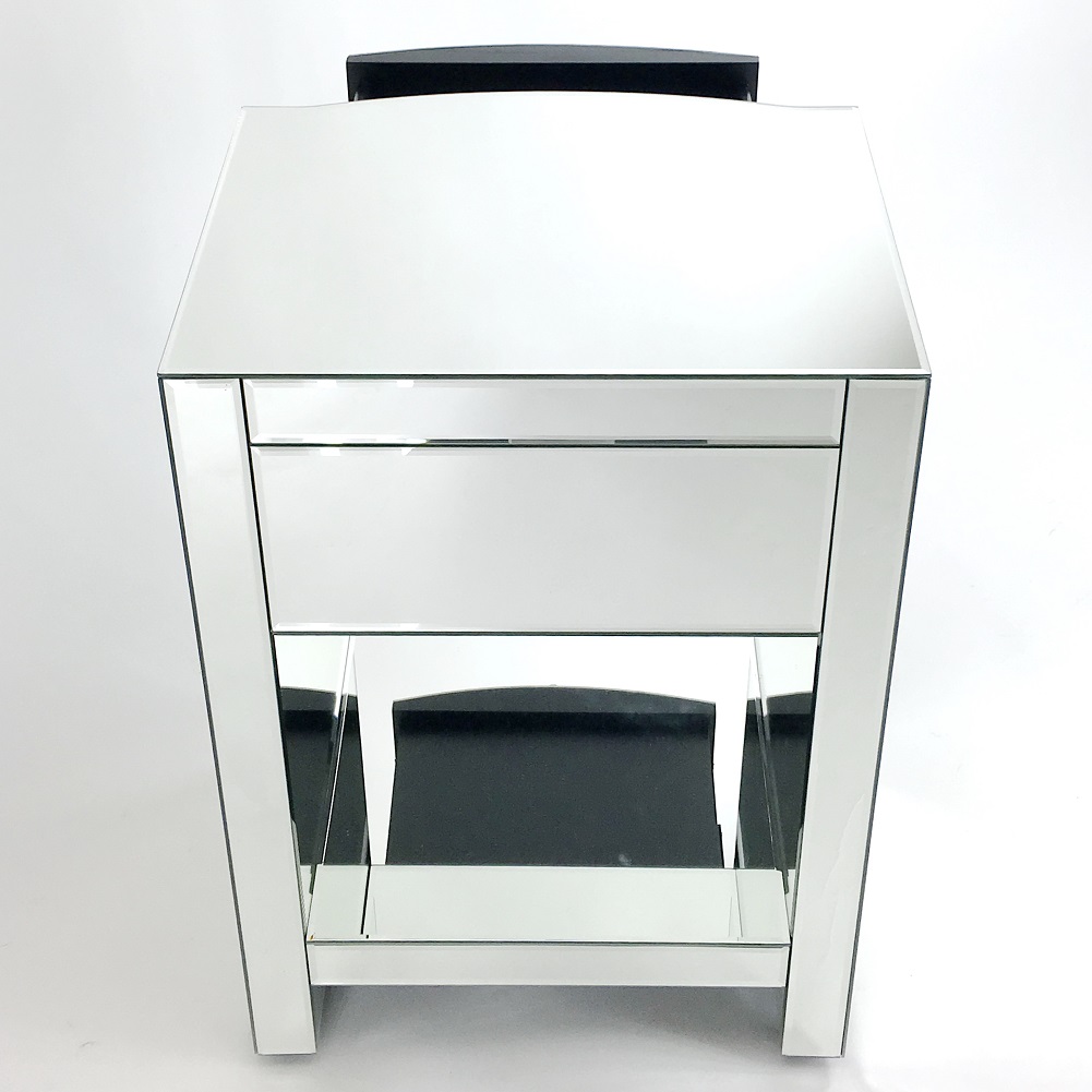 Color: Mirror; Assembly Not Required; Smooth Finish; Item Dimensions: 18″X15″X26″; Drawer is 12Wx12Dx9″H; Drawer stoppers; Open space is 14Wx15Dx12″H; Diamond cut crystal design on chrome handle; Legs 2Wx14Dx3.5″H with adjustable footer height; Mirror on pine wood