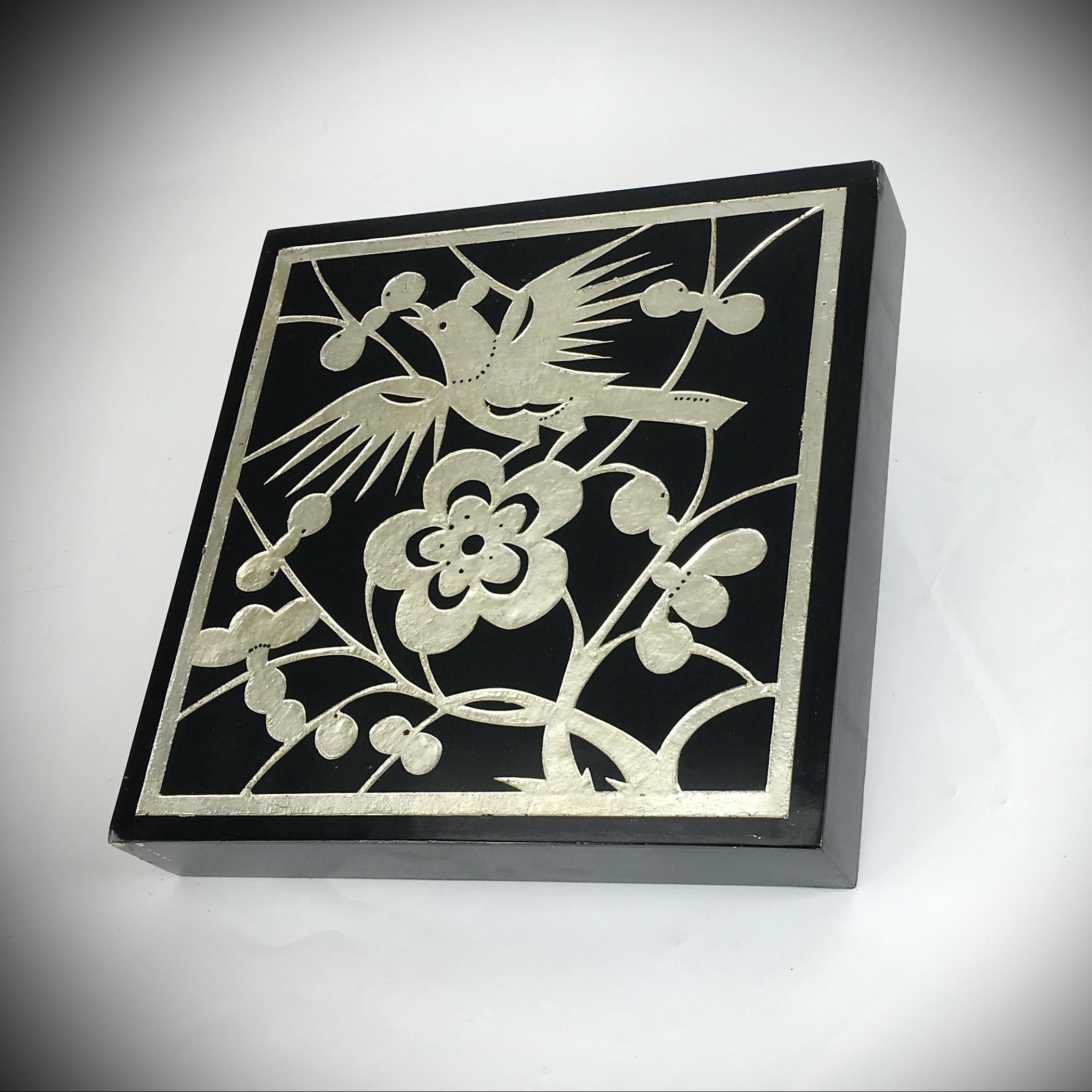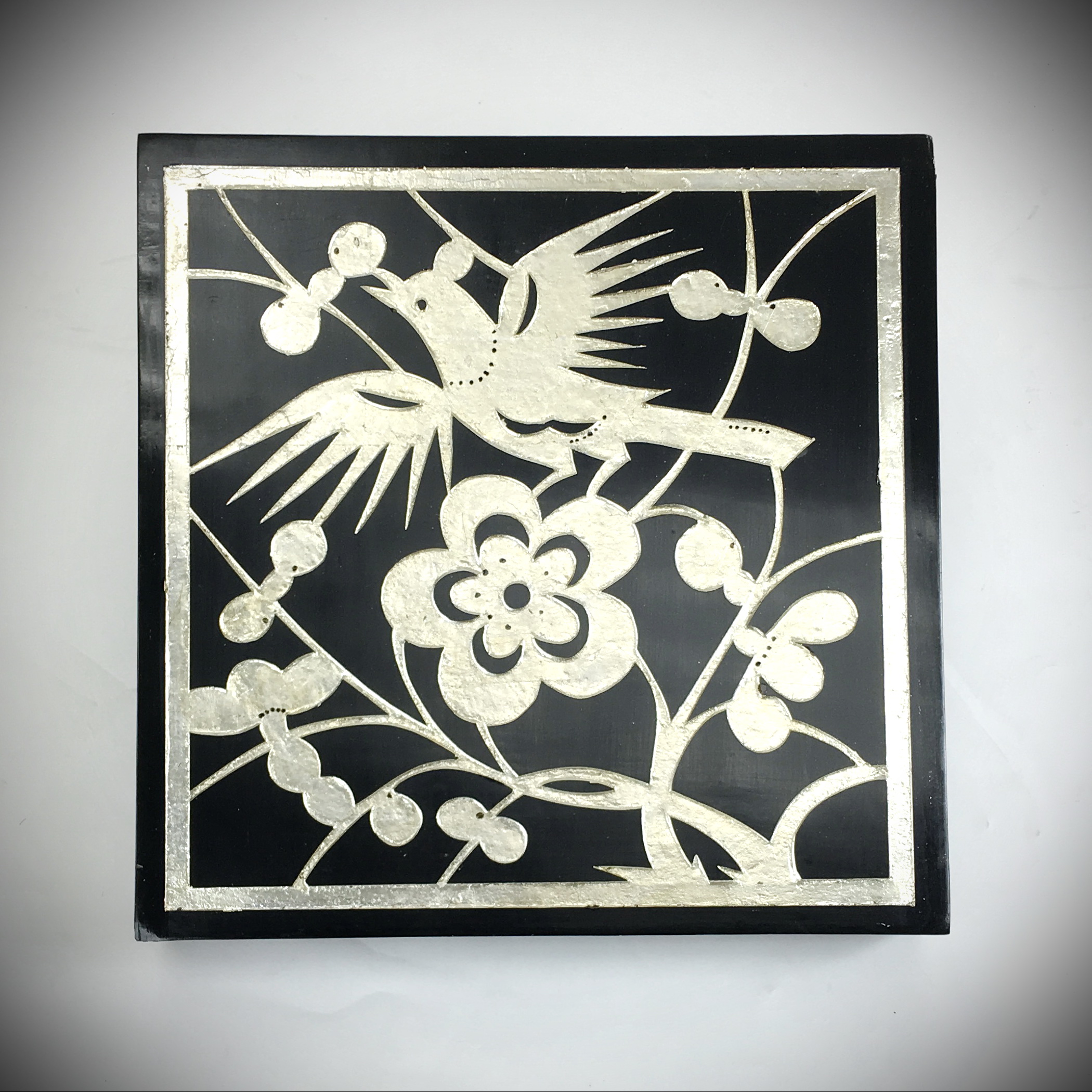 Coromandel style. Phoenix design. Cedar plywood frame. Crackle finish. Coromandel screen start with a cedar plywood frame covered in a cheesecloth material. Then layer after layer of plaster is applied; each layer must dry before another layer can be applied. After all the plaster has been applied several coats of lacquer is put over the entire surface. The design is drawn onto life-sized paper and carefully traced on to the panels. The craftsman then hand carves the design into the screen, through the lacquer into the plaster. Once the screen is done it is painted with water based paint or silver/gold leaf is applied and sealed with a clear lacquer coat.