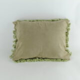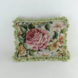 This is a beautiful display of a garden full of flowers with a pink rose as the main focal point. Small tassels around the border of the pillow along with light gold trimming throughout some of the flowers making the image detail stand out.