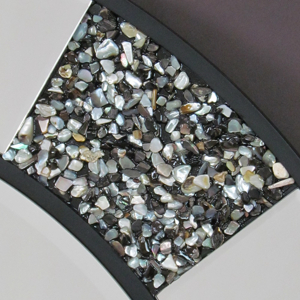 Color: Mirror; Assembly Not Required; Smooth Finish; Item Dimensions: 31.5″X0.75″X31.5″; 1/4″ Frameless Beveled mirror; 1/2″ Pinewood base; 22″ mirror diameter; 5″ x 3.5″ size of the pebble shell and the mirrors in between one another.; Mirror on pine wood