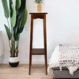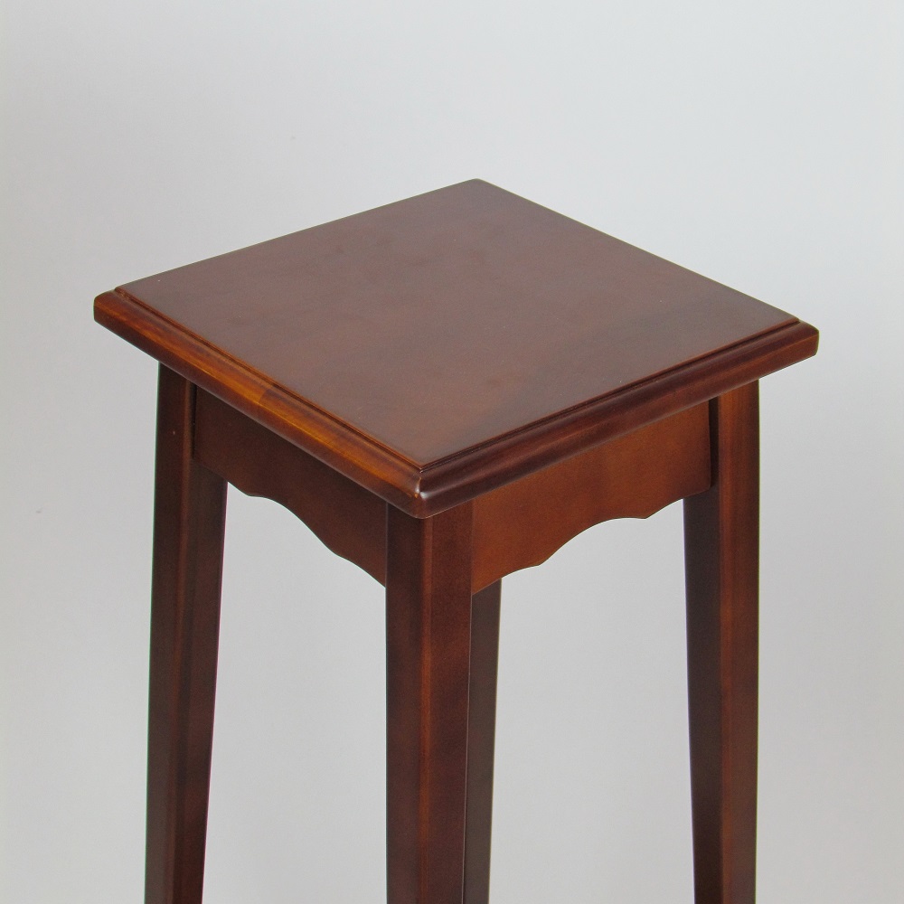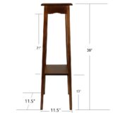 Item Dimension: 12″X12″X39″; Oakwood; Color: Brown; Assembly Required; Smooth Finish; Wooden pedestal; Top measures 1.25Wx1.25Dx5″H; Shelf measures 9.75Wx9.75Dx22″H; Leg is 12″H from shelf to floor
