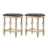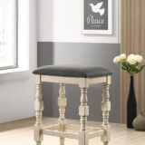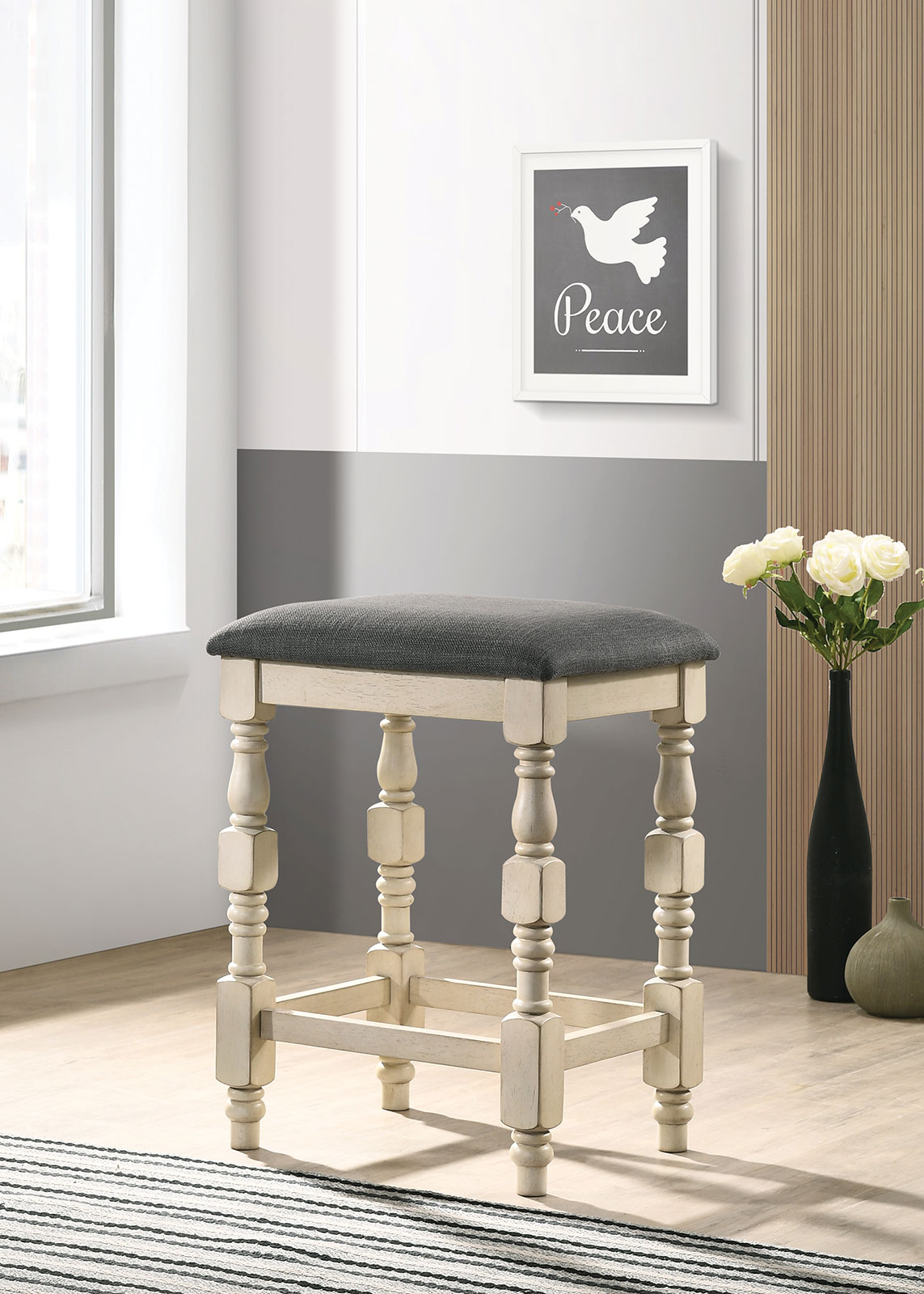 Create a sense of comfort with this vintage ivory and dark gray stool supported by turned legs. Seat is padded and upholstered in gray fabric, which offer a nice contrast to the lighter wood finish.