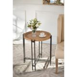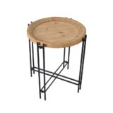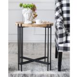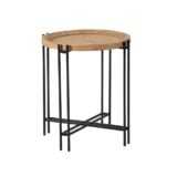 Using pin legs and a large round surface, this modern side table achieves excellent fashion and function with its clever design. A natural wooden tabletop provides a sturdy, attractive surface. Parallel metal legs feature a black finish and form an eye-catching pattern below the wood. The two materials deliver an intriguing contrast while giving this table an appealing contemporary aesthetic.