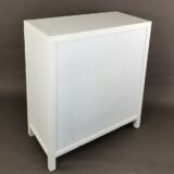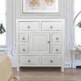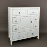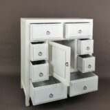 Basswood; Color: Whitewash; Assembly Not Required; Smooth Finish; Eight drawer cabinet with one door; Four sml drawers measure 5.5Wx13.5Dx5.5″H; Four Lrg drawers; 12.5Wx13.5Dx5.5″H; Space behind door 12.5Wx14.5Dx13.5″H; Brass hardware