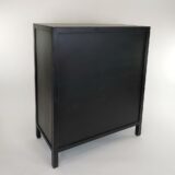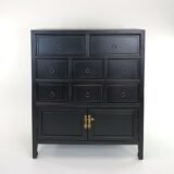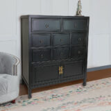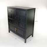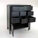 Basswood; Color: Ant. Black; Assembly Not Required; Smooth Finish; Eight drawer cabinet with two doors; Top two drawers 14.5Wx16.5Dx5.75″H; Middle 6 drawers measures 9Wx16.5Dx5.75″H; Space behind doors 32Wx17Dx11″H; Brass hardware
