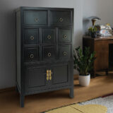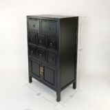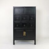 Basswood; Color: Ant. Black; Assembly Not Required; Smooth Finish; Top two drawers 9x14x5.5″H; Middle six drawers are 5.5x14x5.5″H; Space on the bottom is 21×14.5×11″H; Legs are 5″H