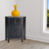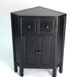 Pinus Sylvestris; Color: Ant. Black; Assembly Not Required; Smooth Finish; Corner cabinet with two drawers & two doors; Drawers 5Wx7Dx5.5″H; Angles measure front to back 15″;; front to corners 6″; Wooden hardware; Legs 5″H