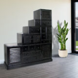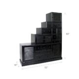 Basswood; Color: Ant. Black; Assembly Not Required; Smooth Finish; Fifteen drawer step cabinet with five doors; Space behind doors are as follows 13Wx15Dx10″H top, 19.5Wx15Dx10″H middle & 13Wx15Dx17.5″H; Drawer measurements are 8 – 5.25Wx13.5Dx5″H, 4 – 19Wx13.5Dx4″H, 2 – 12.25Wx13.5Dx5″H & 1 – 12.25Wx13.5Dx3″H; Wooden hardware; Non reversable